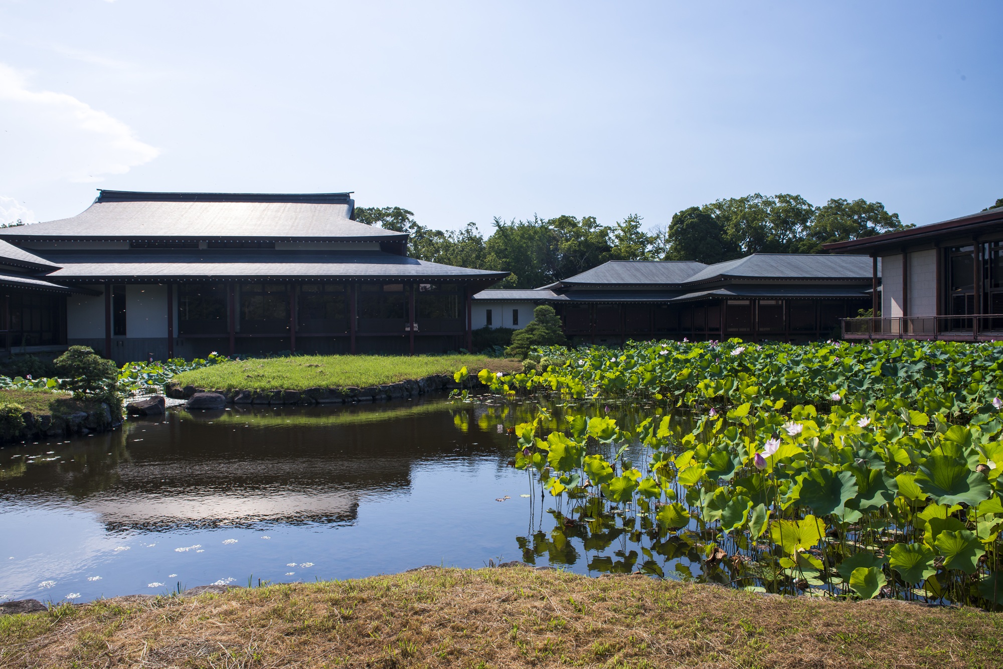 八幡神(やはたのかみ/はちまんしん)が現れたとされる神苑には、京都の広沢池(ひろさわいけ)、奈良の猿沢池(さるさわいけ)と並び日本三沢に数えられる初沢池(はつさわいけ)や、能楽堂が立つ菱形池、屋根つきの神橋が架かる寄藻川(よりもがわ)などの美観が。