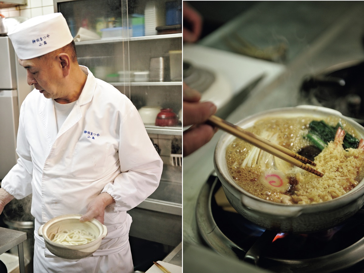 店のある神田須田町(かんだすだちょう)は江戸時代以来、東京有数の繁華街として発展。風格ある店のたたずまいは、そば・うどんの一杯の景色にも表れます。「鍋焼うどん」に入る天ぷらは、ころもが華やかな〝いかだ揚げ〟。笹形に切ったかまぼこなど、煮込む間に具材の旨みがつゆに溶け込むような工夫と手わざが光ります。千住(せんじゅ)ねぎの味わいも、冬は一層美味。卵、餅、三つ葉の入る豪華な「寄せ鍋うどん」もありますが、こざっぱりしたこの一品が根強い人気です。