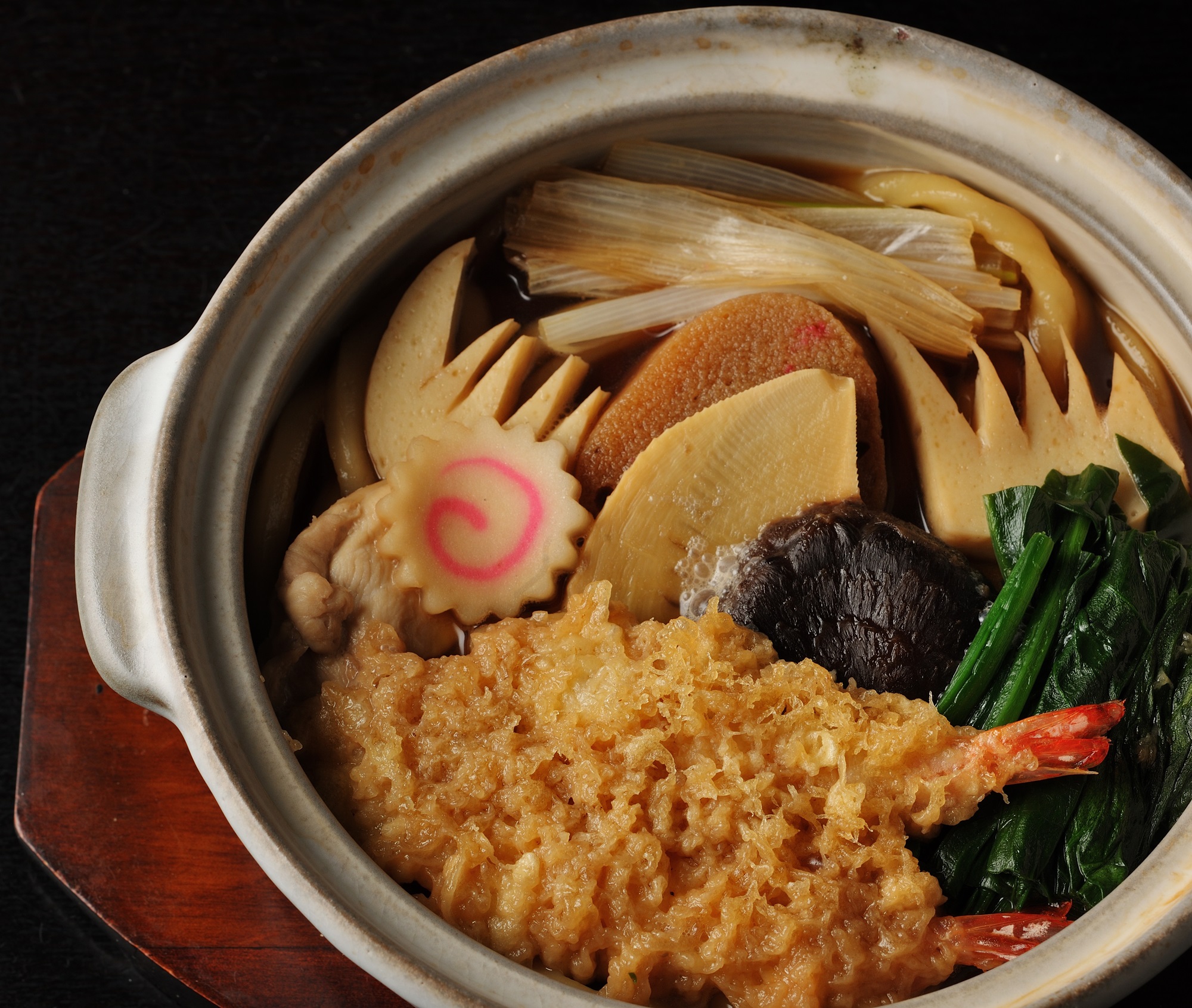 煮込む時間が短いだけに、各具材の味つけがつゆに混ざらないのも、この鍋焼きうどんの面白さ。