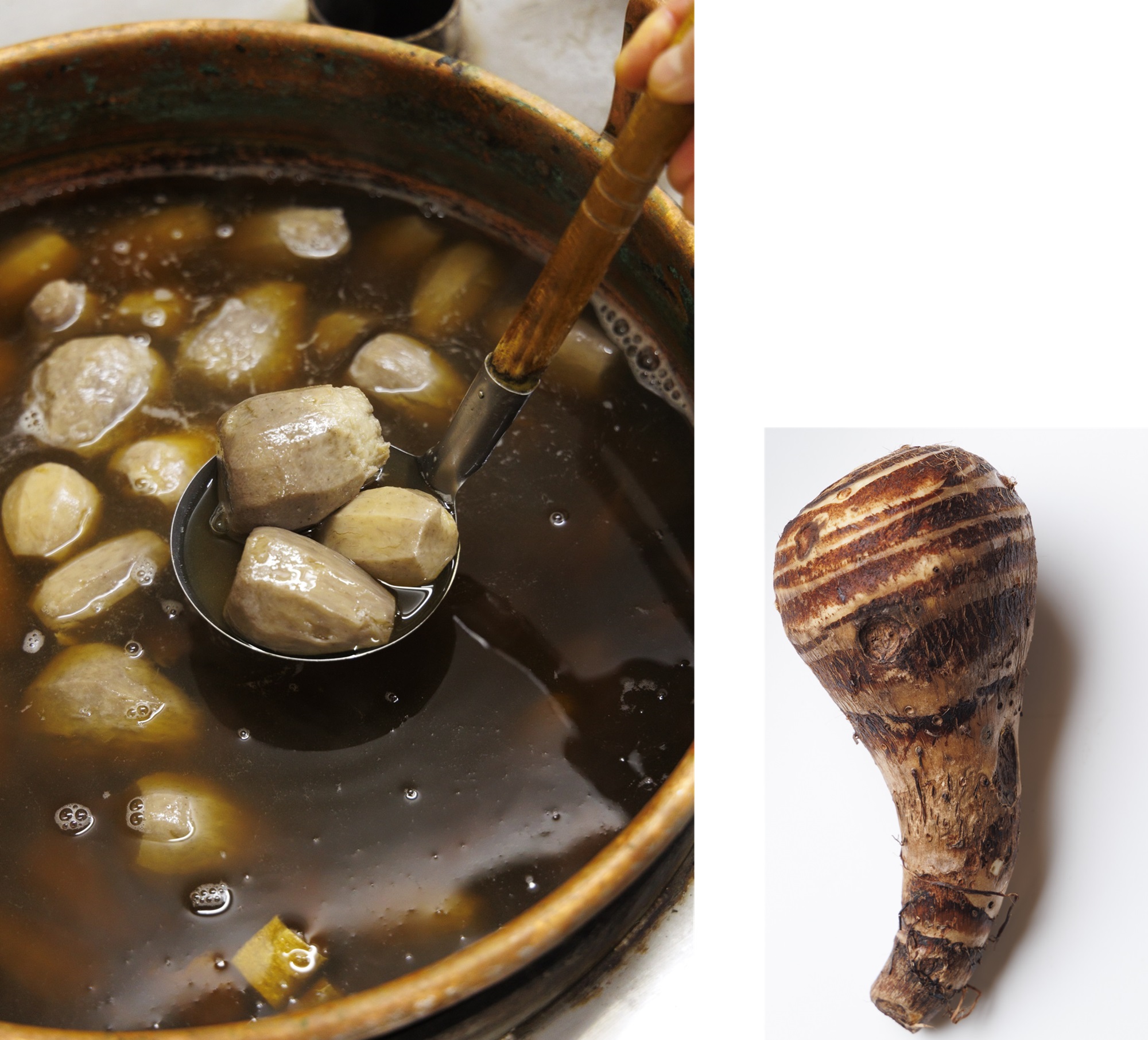 左/銅鍋で一度に100人分を炊き上げる。2日かけて煮含めた醬油の甘辛い味は、ごはんが進む。棒鱈は骨まで食べられるほどやわらかい。右/「いもぼう」に使われる質のいい海老芋。