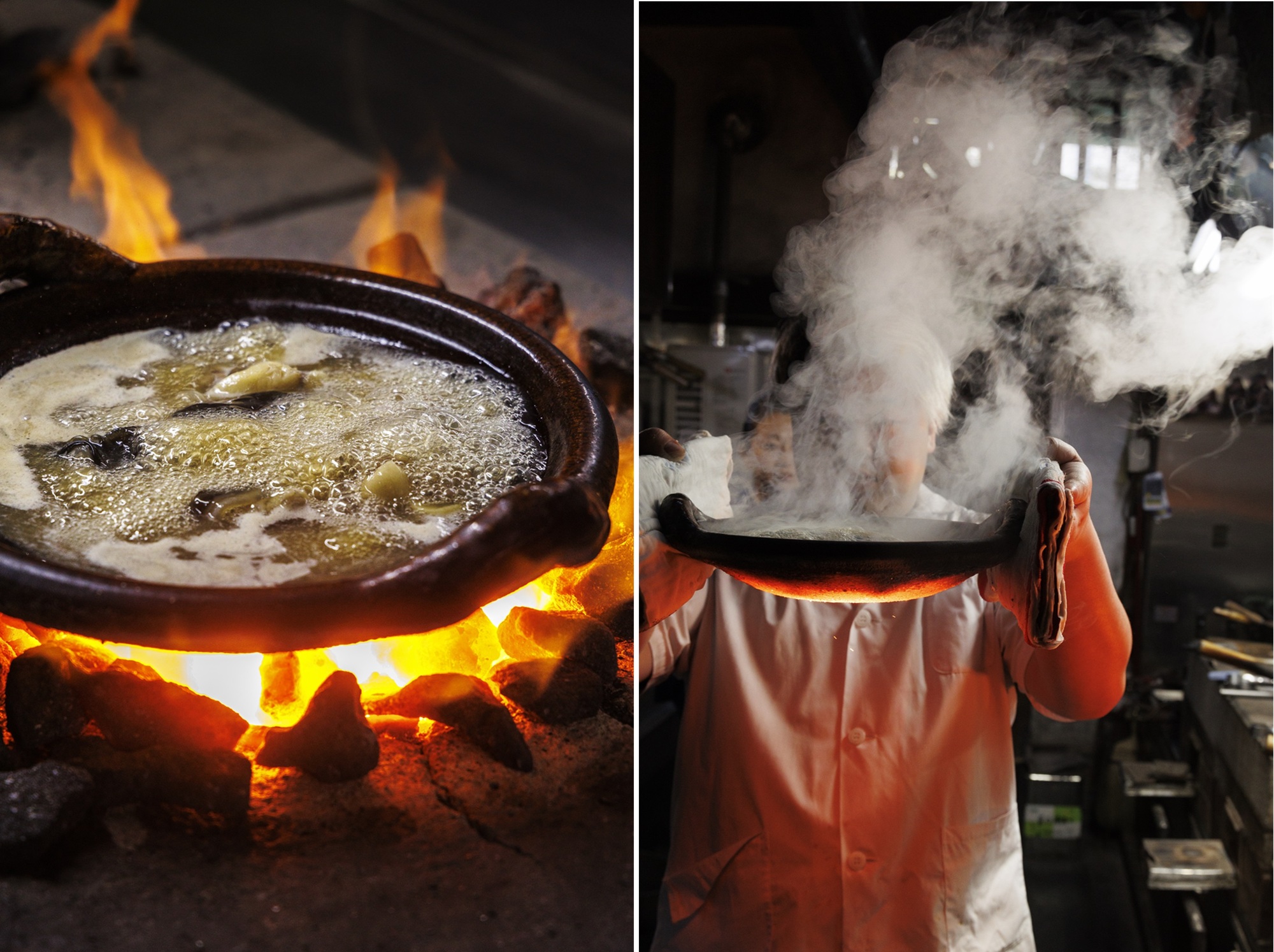 コークスを使い、1600℃を超える火力で鍋に仕立てる調理法。あらかじめ下味のついたすっぽんと出汁を合わせるのに、これだけの火力を用いるのは、日本中でもこの店だけ。